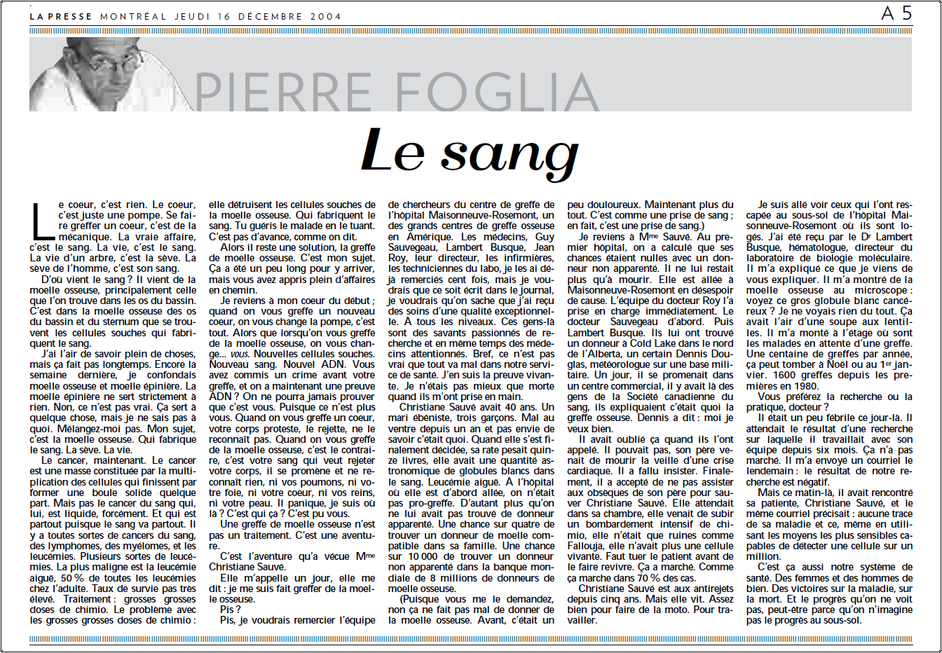 En décembre 2004, Pierre Foglia rencontre une de nos patientes qui a reçu une greffe de cellules souches à HMR, ainsi que les médecins qui l'ont traitée.